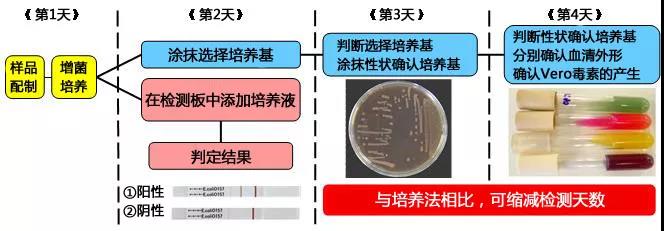 在依据公定法对肠出血性大肠杆菌O157进行检测时,从样品配制到获得各种结果,需要花费4天时间。但采用免疫层析法检测的话,仅仅需要2天时间(※)