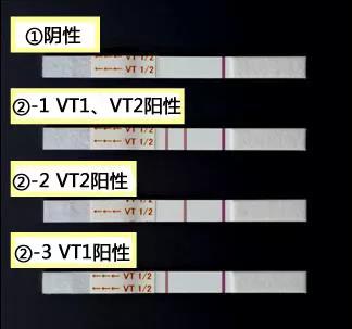 ②-1:检测开始15分钟后,可以分别在VT1检测线、VT2检测线和参照线位置观察到紫红色线时,可判定VT1和VT2均为阳性。