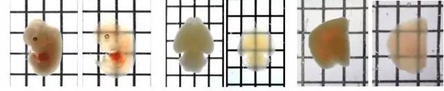 左起依次为经SeeDB液透明化处理的小鼠幼胎(幼胎12天)、新生鼠(生后3天)的全脑、成鼠大脑(8周龄,厚度2mm)