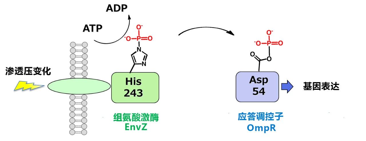 细菌通过将信息从组氨酸激酶EnvZ传递到应答调控子OmpR来调节基因的表达。分别分析有自磷酸化能力的EnvZ激酶和被EnvZ催化的OmpR中组氨酸和天门冬氨酸的磷酸化。