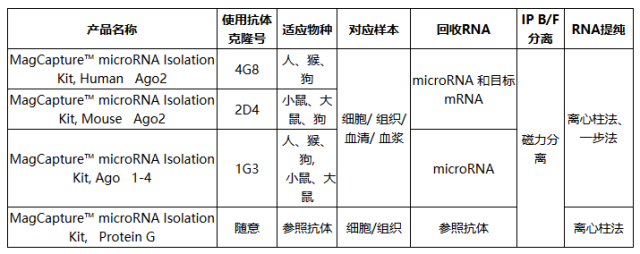 该系列有抗人Ago2抗体(4G8)、抗鼠Ago2抗体(2D4)、抗Ago1-4抗体(1G3)包被磁珠的三种试剂盒以及含有可固定任