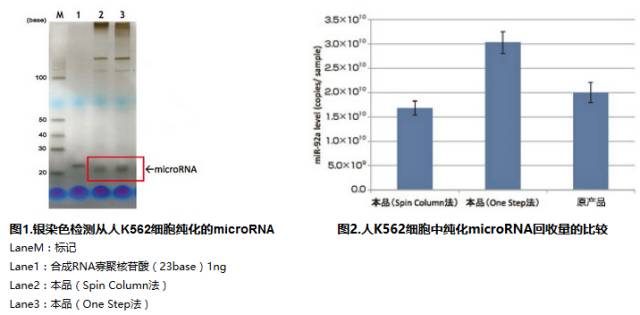 用变性聚丙烯酰胺凝胶电泳法(银染色)确认通过本产品(MagCapture™ microRNA Isolation Kit, Human Ago2)从人K562细胞(1×107 cells)中获得的microRNA(图1)。结果表明,使用本产品可获得高纯度的microRNA。此外,通过定量PCR法(miR-92a量),与使用原产品microRNA Isolation Kit, Human Ago2所获得的microRNA量相比较可知(图2),本产品的离心柱法显示与原产品几乎一样的microRNA回收性能;另外,在一步法中显示出了比原产品更优秀的microRNA回收性能。