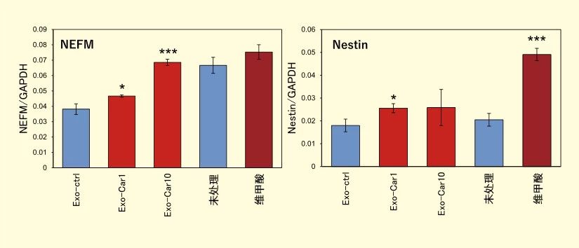 首先我们使用了人结肠癌来源细胞Caco-2作为人培养肠道细胞的模型。用MagCapture™ Exosome Isolaton Kit PS从经过肌肽处理的Caco-2细胞培养上清中分离并纯化外泌体10)。然后把所得的外泌体添加到人神经母细胞瘤SH-SY5Y中进行培养,可以观察到SH-SY5Y轴突的伸长(图3)以及轴突标记基因(Neurofilament Medium( NEFM), Nestin,图4)表达的增强。从以上结果可以明确地看出,从经过肌肽处理的Caco-2细胞中,所分泌的外泌体促进SH-SY5Y细胞轴突伸长。