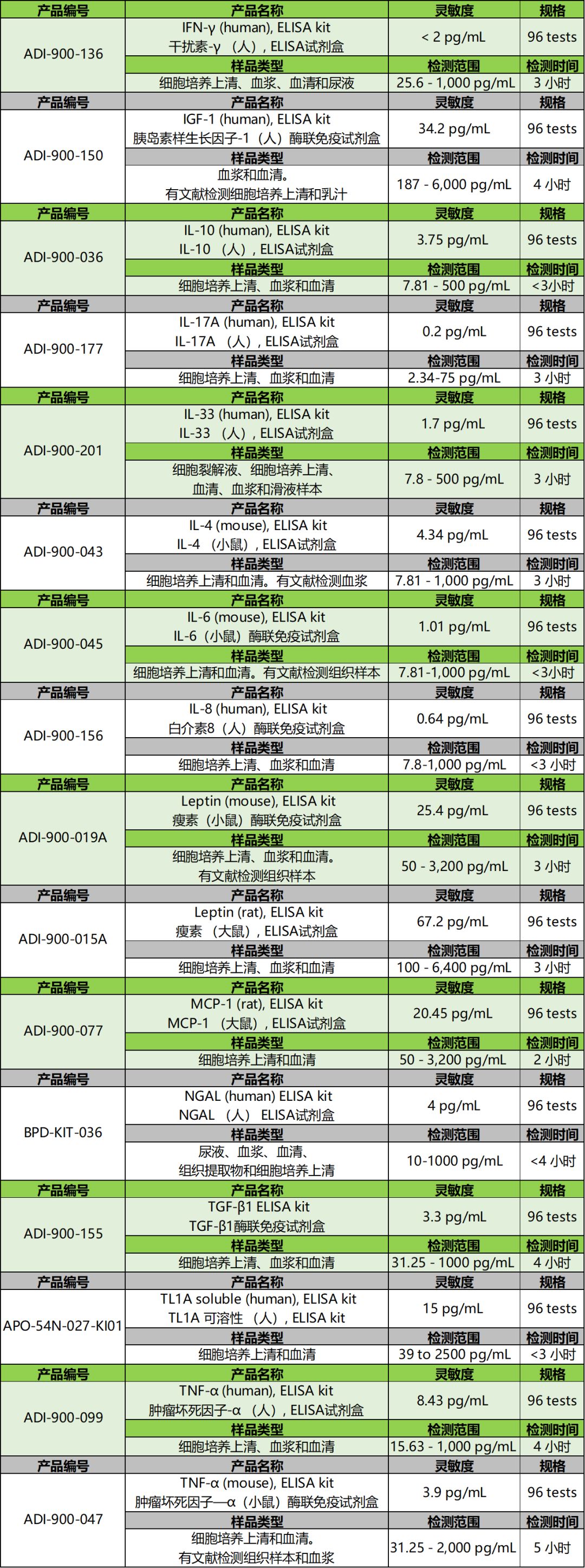 细胞因子,包括白介素、干扰素和趋化因子,是细胞调节免疫、炎症和一些胚胎发育过程中所分泌的信号分子。细胞因子在血管生成和癌症中也发挥了重要作用。细胞因子具有多向性、重叠性、甚至有时相互对立的功能。这主要是与其浓度、作用的细胞类型,以及其他细胞因子和介质的存在有关。Enzo Life Sciences针对先天性和适应性免疫研究,可提供多种细胞因子抗体、蛋白、和试剂盒,包括多种高特异性的人和小鼠细胞因子ELISA试剂盒。