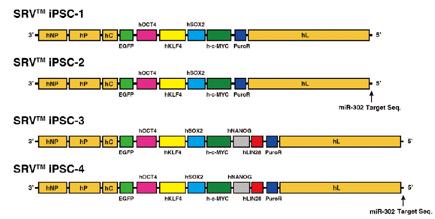 SRV ™ iPSC-2和SRV ™ iPSC-4具有响应miR-302后自动消除载体的系统。这种机制对于用血细胞生产iPS细胞非常有效。