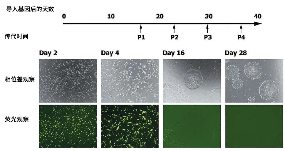 基因导入后第4天观察到EGFP荧光,证明该基因已被导入至几乎所有细胞中并已被表达。另一方面,在发生第一次传代前的第16天,已经出现了iPS细胞的集落,但几乎观察不到EGFP的荧光,由此可以确定载体已被自动消除。