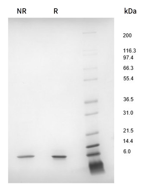 图2.  CTGrade rh IL-15(1 μg)在非还原(NR)和还原(R)条件下用SDS-PAGE分析,并通过InstantBlue™ 可视化迅蓝染色显示 6 kDa 处有一条明显的条带。预测的分子量为 12.9 kDa,但在SDS-PAGE上运行,分子量约为6 kDa。