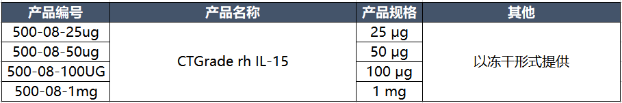 ● 与其他常见的γ链细胞因子(IL-2、IL-7和IL-21)结合,在过继细胞疗法(如CAR-T细胞疗法)中促进有利的抗肿瘤表型