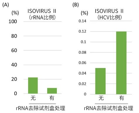 人类发现病毒的存在大约是在1900年,其契机是动植物间出现的一种原因不明的传染病。在寻找致病病原体的过程中,由于它比当时已知的最小病原体(微生物)更小,且具有异质性,因此被命名为"病毒"。此后,研究人员在所有生物体内都发现了各种不同类型的病毒,现在病毒被认为是细胞生物体内普遍存在的绝对寄生因子。RNA病毒是以RNA为基因组的病毒的总称,从狭义上讲,是指去除在其生命周期内同时利用DNA的逆转录病毒(例如HIV的基因组是RNA,但它能经过逆转录进入宿主的基因组DNA中)的病毒群。它包含多种对人类,家畜和植物等经济型生物有重大危害的病毒,例如典型的SARS-CoV-2、流感病毒、寨卡病毒和丙型肝炎病毒。对于肉眼无法看见且难以培养的RNA病毒,”发现”其存在至关重要。不仅是医疗领域,还需要更进一步展开关于这些RNA病毒的起源和传播的全健康(one health)研究,并从包含RNA病毒的全球生态系统的角度对其进行认识。因此,基于各种目的的RNA病毒检测方法也应运而生,本文将基于"双链RNA"的方法介绍其应用于高等动物组织的案例。◆利用双链RNA检测RNA病毒的原理不携带RNA病毒的细胞几乎不存在长双链RNA。但是,存在RNA病毒时,RNA病毒基因组的复制过程中会产生双链RNA,因此,如果在生物样品中检测出双链RNA,则表明存在RNA病毒1),此处的关键在于双链RNA的纯化技术。纯化主要使用的是利用双链RNA结合于纤维素树脂的性质的柱色谱法1-3),和使用双链RNA结合蛋白和抗双链RNA抗体的方法,以及通过DNA和单链RNA的分解留下双链RNA的方法。通过解码得到的双链RNA,也可以选择性地确定RNA病毒基因组4-8)。◆动物组织中的双链RNA的纯化和解码由于几乎没有从高等动物样品纯化双链RNA的报告,因此我们首先使用被广泛使用的纤维素树脂进行纯化。使用市售肉糜的测试结果表明,rRNA的读数比例的约占90%,通过分子内互补结合,残留了大量具有部分双链RNA结构的rRNA(图1左)。相同的方法应用于真菌、植物、昆虫时,rRNA读数比例仅为百分之几,表明这是高等动物样品特有的课题。因此,将使用相同方法纯化的双链RNA溶液进一步用市售的rRNA去除试剂盒进行处理,可将rRNA读数比例减少到20%左右(图1右)。图1. 肉糜样品中,普通的双链RNA纯化会残留大量rRNA使用自制核酸纯化柱通过纤维素树脂从肉糜样品中纯化双链RNA。为了阐明rRNA的去除效果,将获得的双链RNA组分进行分组,准备已去除rRNA的样品和未去除rRNA的样品,分别通过FLDS法9)进行测序。通过SortMeRNA软件计算rRNA在清理后的数据中所占的比例。但是,使用rRNA去除试剂盒会使每个样品的成本增加1万日元左右,处理过程也会变得繁琐且耗时。因此,使用ISOVIRUS Ⅱ(使用纤维素树脂纯化双链RNA用试剂盒, ISOVIRUS的动物样品版)对人肝脏样品进行测试。结果表明,使用ISOVIRUS Ⅱ时,即使不经过rRNA去除工序,也可将rRNA读数比例抑制在20%左右(图2A左)。当ISOVIRUS Ⅱ与rRNA去除试剂盒配合使用时,可进一步降低rRNA读数比例至10%以下(图2A右)。并且,该样品来源为HCV阳性患者,因此也能检测出HCV读数(图2B)。图2. ISOVIRUS Ⅱ的rRNA残留量少使用ISOVIRUS Ⅱ通过纤维素树脂从人肝脏样品中纯化双链RNA。为了阐明rRNA的去除效果,将获得的双链RNA组分进行分组,准备已去除rRNA的样品和未去除rRNA的样品,分别通过Modified dsRNA-seq法4)进行测序。通过SortMeRNA软件计算rRNA在清理后的数据中所占的比例,并通过绘图计算HCV的比例。◆结语双链RNA作为RNA病毒感染的分子标志物,近50年来一直为提高RNA病毒的探索效率做出贡献。实际上,笔者以前报告的Modified dsRNA-seq方法已成功捕获以极低复制率潜藏在人体器官中的HCV。与采用一般的RNA病毒探索方法相比,检测灵敏度高数百倍,且无需花费巨额测序成本就能全面检测RNA病毒。直到最近,双链RNA纯化还没有试剂盒化,而是作为每个研究室传承的特殊技术。但是,随着ISOVIRUS系列的推出,它成为了人人都能使用的技术。并且,ISOVIRUS Ⅱ还有望消除昂贵且繁琐的rRNA去除工序,大幅降低从高等动物样品中探索RNA病毒的成本。在RNA疫苗的生产中,需要去除作为副产物产生的双链RNA,以避免不必要的自然免疫激活10)。ISOVIRUS系列能够稳定地回收可能仅微量存在的HCV来源双链RNA,并且具有数百ng量级的高结合容量,还有望用于上述RNA疫苗的生产。◆参考文献 1. Morris, T. J. and Dodds, J. A. : Phytopathology, 69, 854 (1979). 2. Marquez, L. M. et al. : Science, 315, 513 (2007). 3. Okada, R. et al. : J. Gen. Plant Pathol., 81, 103 (2015). 4. Izumi, T. et al. : Viruses, 13, 1310 (2021). 5. Hirai, M. et al. : Microbes Environ., 36, ME20152 (2021). 6. Roossinck, M. J. et al. : Mol. Ecol., 19 Suppl 1, 81 (2010). 7. Decker, C. J. et al. : Viruses, 11, 943 (2019). 8. Yanagisawa, H. et al. : Viruses, 8, 70 (2016). 9. Urayama, S. et al. : Mol. Ecol. Resour., 18, 1444 (2018).10. Rosa, S. S. et al. : Vaccine, 39, 2190 (2021).◆注释双链RNA两个具有互补序列的RNA分子形成碱基对,具有双螺旋结构的RNA分子。读数(比例)指通过新一代测序技术获得的庞大数量的碱基序列之一。在庞大的读数中,表示特定序列所占的百分比时,称为"读数比例"。HCV丙型肝炎病毒(HepatitisCvirus)的简称。多数的慢性感染患者被认为会发展成肝硬化或肝癌。◆相关产品双链RNA纯化试剂盒※ 仅供实验研究用,不可用于临床诊断。
