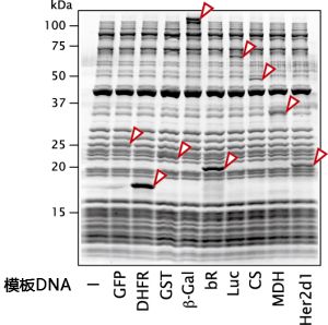 通过向PUREfrex®(#PF001)的反应体系中添加DNA(或mRNA)并进行反应,不仅可以合成原核生物来源的蛋白,也可以合成真核生物来源的蛋白。例如,合成大肠杆菌的DHFR时,一个试剂盒(500 μL)可以合成50 μg以上的DHFR。下图的电泳是反应产物。
