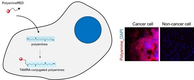 PolyamineRED拥有细胞膜透过性,在细胞内与多胺发生反应并将TAMRA偶联至多胺。由于TAMRA与多胺结合后会失去膜透过性,所以可以通过清洗去除未反应的PolyamineRED,因此可选择性实现细胞内多胺的可视化。已知多胺会在癌细胞中过量产生,所以使用PolyamineRED可以检测出癌细胞中重要的多胺信号。详情请参考应用实例。