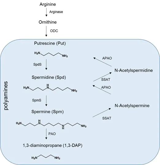 多胺是含有两个或以上氨基的直链烷基胺的总称。已从生物体中鉴定出各种结构的多胺,主要为腐胺(putrescine),亚精胺(Spermidine)和精胺(Spermine)。以亚mM~mM的高浓度存在于哺乳动物、微生物、植物的细胞中。