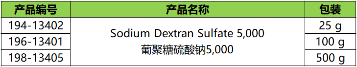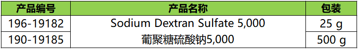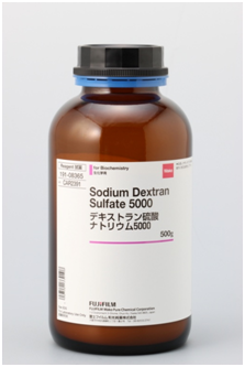 葡聚糖硫酸钠,是一种由葡萄糖聚合,经硫酸化后所得的化合物。本产品的平均分子量约为5,000(分子量范围:1,000-9,000),是聚阴离子物质。在细胞培养中,本品可通过改变细胞表面的电荷,来促使单个细胞悬浮,防止细胞结团,是一种被广泛用于重组蛋白生产的抗结团剂。