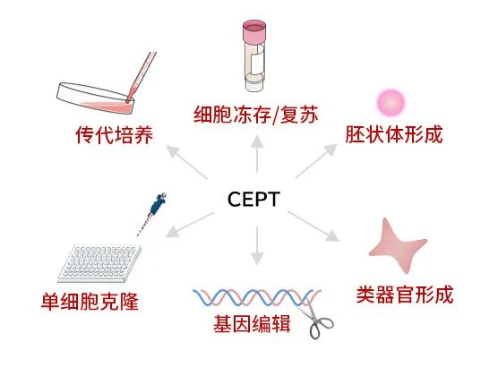 此外,与基于hPSCs的胚状体和类器官形成、单细胞克隆和基因编辑等干细胞研究中所用的现有培养方法相比,CEPT还可改善细胞存活率1,2,3)。