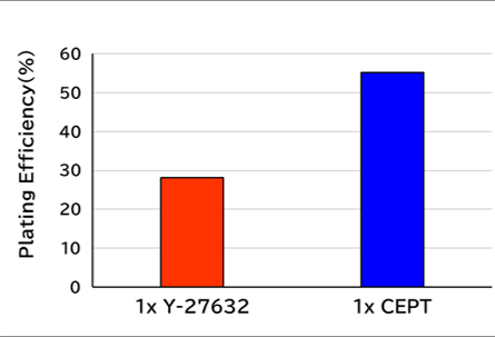 研究表明,CEPT可防止人ES/iPS细胞(人多能干细胞:hPSCs)在细胞传代中的细胞应激和DNA损伤1)。与强效ROCK抑制剂Y-27632相似,可提高细胞传代和冻存时hPSCs的存活率。
