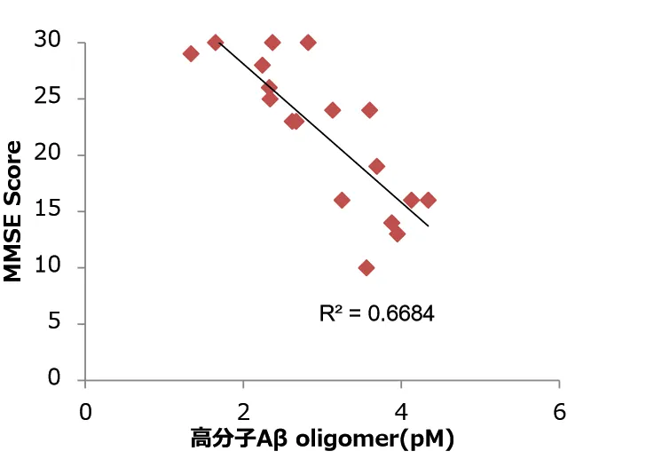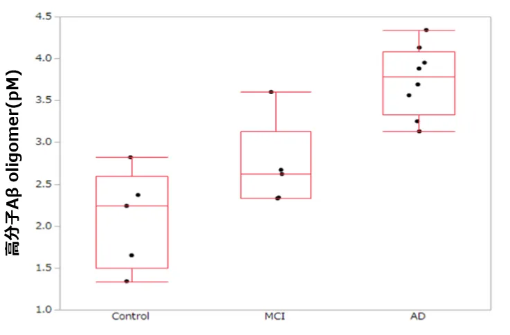 非认知症患者(Control)、轻度认知障碍患者(MCI)阿尔茨海默病患者(AD)间的检测值差异明显。结果表明,高分子Aβ寡聚体的检测值与MMSE Score相关。
