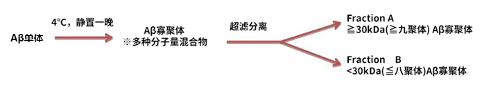 将Aβ1-42肽冷藏并孵育过夜后,通过超滤分离为不足30 kDa(8聚体以下)和30 kDa以上(9聚体以上),并使用Aβ抗体(BAN50)对各组进行Western Blot和ELISA(本方法)检测。