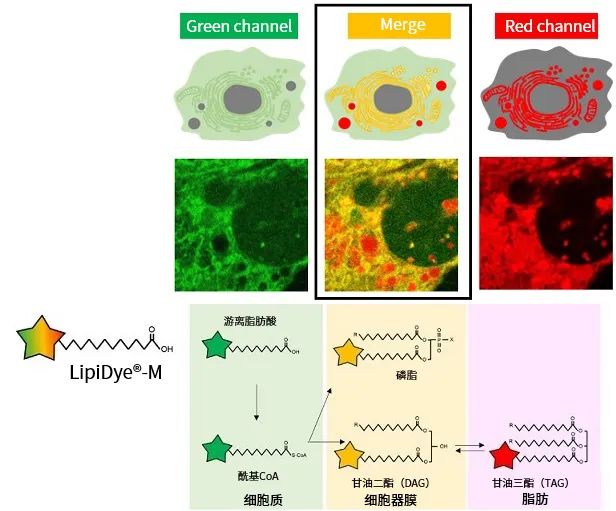 ● 根据脂肪酸代谢和细胞器环境的不同,荧光颜色呈绿色~红色变化。