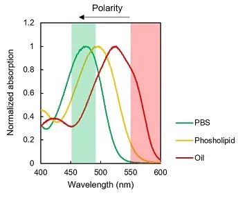 ● 荧光在强极性环境(细胞质)下呈绿色、中极性环境(细胞膜)下呈黄色、弱极性环境(脂滴)下呈红色。