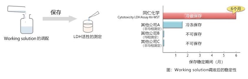 LDH Assay使用的Working solution可以冷藏储存6个月(从配液后算起)。由于配制后的溶液稳定,可以防止试剂的浪费。