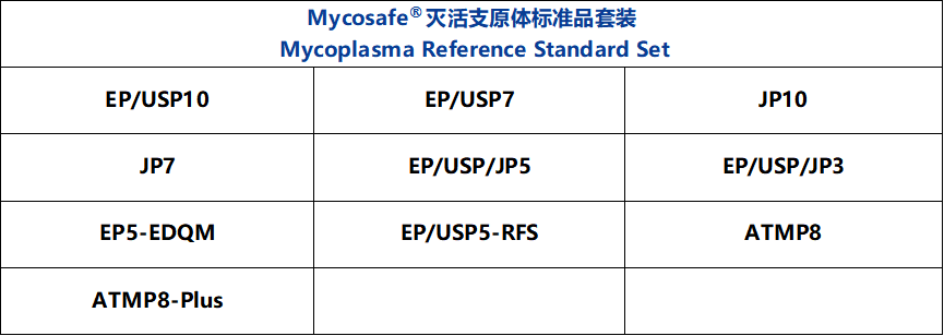 • 药典 EP第2.6.7章、USP第<63>章和JP第17版第G3章中所列出的所有10种支原体菌株。