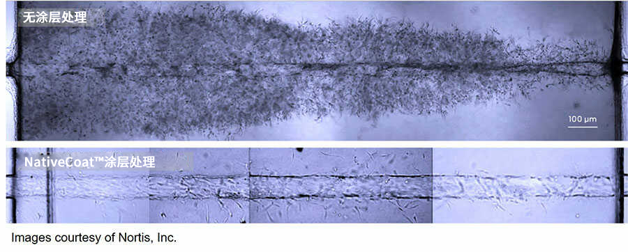将原代人肝窦内皮细胞在肝脏芯片内培养7天。如果微流控通道没有进行涂层处理,细胞便会向通道外无序增殖,随后失去增殖活性。而使用NativeCoat™ 肝ECM进行涂层处理后,能够观察到细胞在通道内有序增殖。