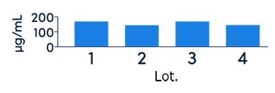 (c)对复数批次间的NativeCoat™ 肝ECM的胶原含量进行定量,结果显示各批次间的数值具有一致性。