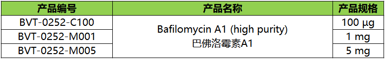 巴弗洛霉素A1是一种高效的囊泡型H+-ATPase选择性抑制剂。它也是一种强效的细胞自噬抑制剂,可以通过阻断自噬小体与溶酶体融合或通过阻断溶酶体降解来抑制细胞自噬。