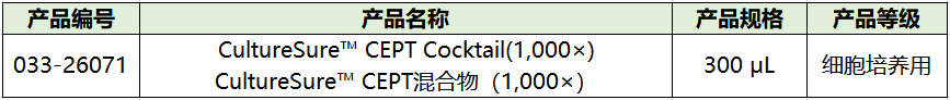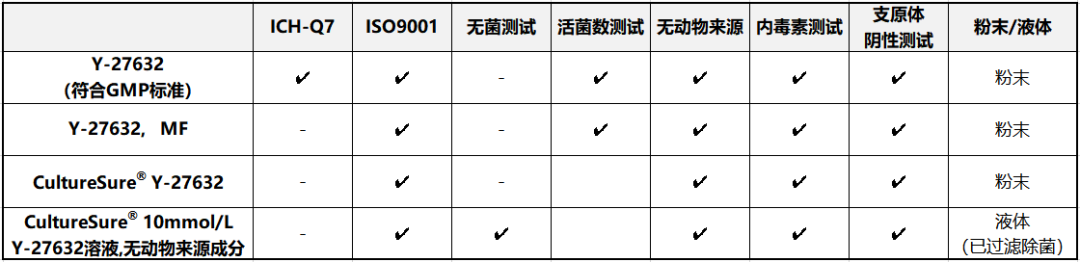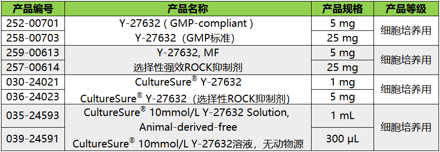通过添加Y-27632至培养基中,可抑制人ES细胞或人iPS细胞在细胞分散时的细胞死亡,还可提高冻存后的iPSC存活率。Y-27632是一种选择性强效ROCK(Rho-associated coiled-coil forming kinase/Rho binding kinase)抑制剂,具有通过ROCK信号传递系统收缩血管平滑肌等多种功能。