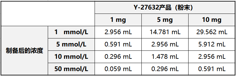 粉末状的Y-27632产品已确认可溶于水。制备至所需浓度后,请在过滤灭菌后使用。
