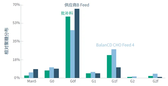 图2. 从BalanCD CHO Feed 4和供应商B补料的分批补料培养物中收获的生物类似药的聚糖图谱比较。测定了各糖型的相对丰度。