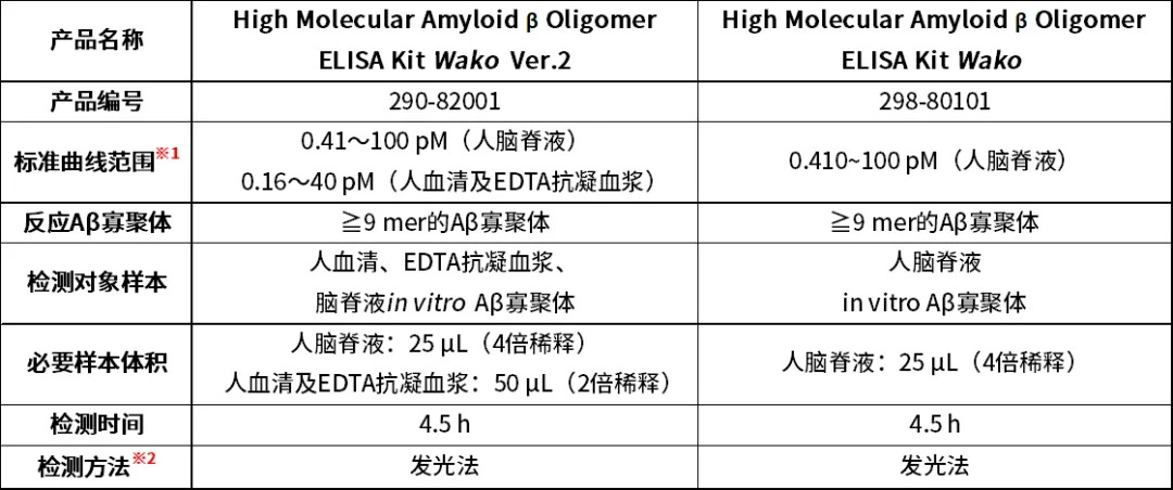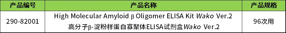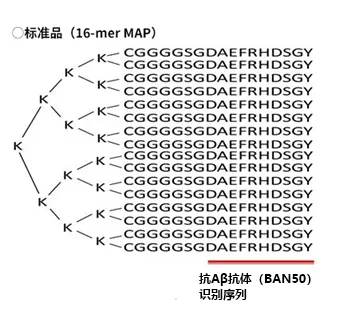本系列采取双抗体夹心法ELISA,使用抗Aβ抗体(BAN50)作为捕获抗体和检测抗体,与1~8-mer几乎不发生反应,与9-mer以上的Aβ寡聚体则发生特异性反应。使用带有16个抗Aβ抗体(BAN50的抗体识别序列的16-mer MAP肽作为标准品。