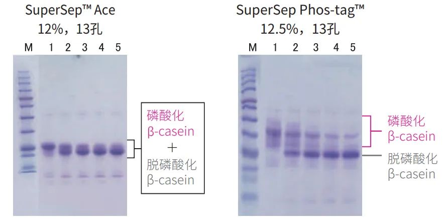 SuperSep™ Phos-tag™ 系列是专为磷酸化蛋白的分离而设计的预制胶,由Phos-tag™ 丙烯酰胺制备而成,利用螯合有金属离子的Phos-tag™ 可以特异性结合磷酸化基团的特点 ,区分不同磷酸化水平的蛋白质。即开即用,无需繁琐配制。