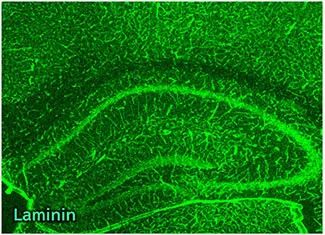 在中枢神经系中,层粘连蛋白几乎只在血管周边的基底膜中表达,被用作血管的标志物。既往的研究显示,脑血管基底膜内层(内皮侧)含有层粘连蛋白-411和-511,而外层(脑实质侧)含有层粘连蛋白-211和-1111),参与血脑屏障(BBB: Blood-Brain Barrier)的形成与功能。