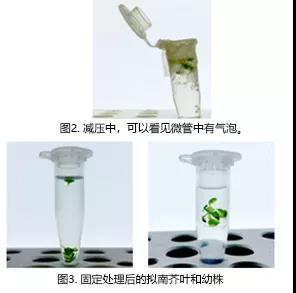 稻叶在透明化时,由于叶子的表面有蜡层,因此很难将溶液渗入组织里,通过在氯仿等有机溶剂中浸泡10~30秒除蜡后,开始固定的步骤。