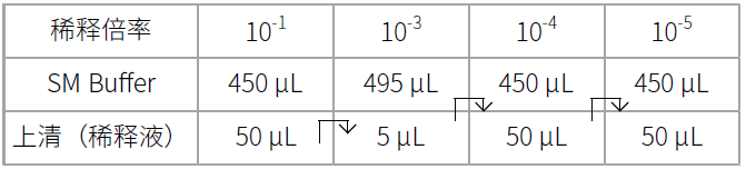 ① 稍微离心(3,000×g,5ec)包装反应后的噬菌体液,沉降残留,使用SM Buffer 105倍(100,000倍)稀释※4)上清。