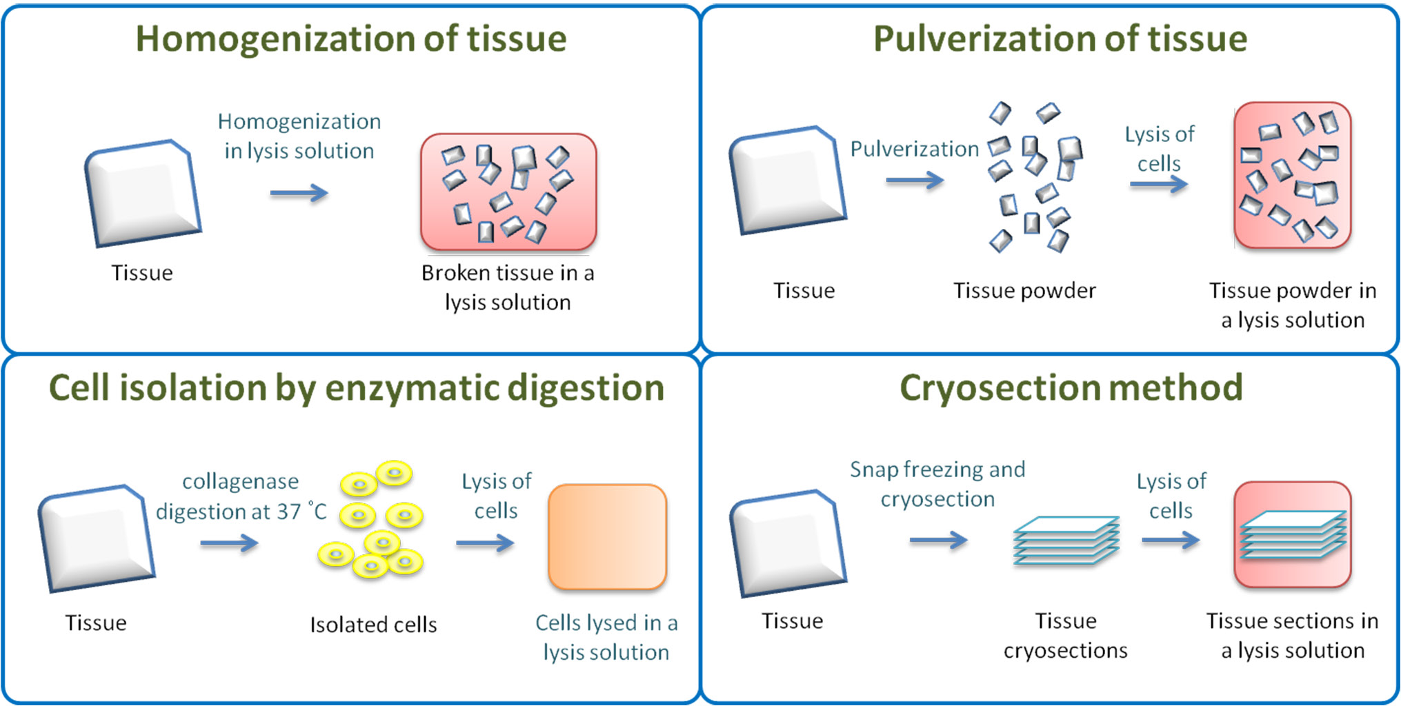 3.1称量组织,然后使用干净的解剖刀切成小块(图1左上)。 冷冻的组织应切成薄片(图1右下),并在RIPA缓冲液(Total蛋白检测:添加蛋白酶抑制剂;磷酸化蛋白检测:添加蛋白酶抑制剂+磷酸酶抑制剂)中解冻。